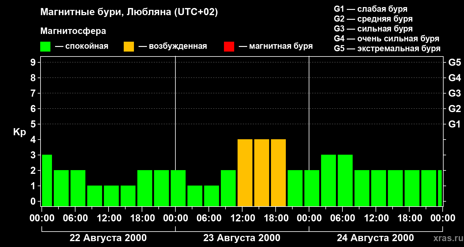 Изменения геомагнитного индекса Kp с 22 по 24 августа 2000 года для средних широт