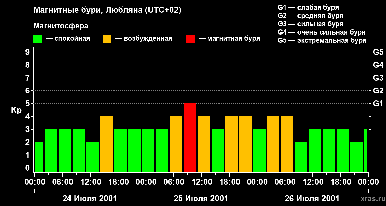 Изменения геомагнитного индекса Kp с 24 по 26 июля 2001 года для средних широт