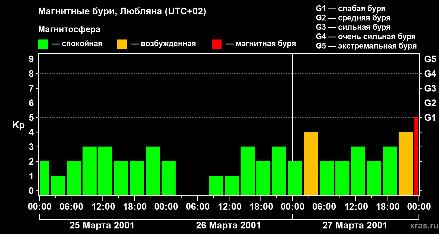 Изменения геомагнитного индекса Kp с 25 по 27 марта 2001 года для средних широт