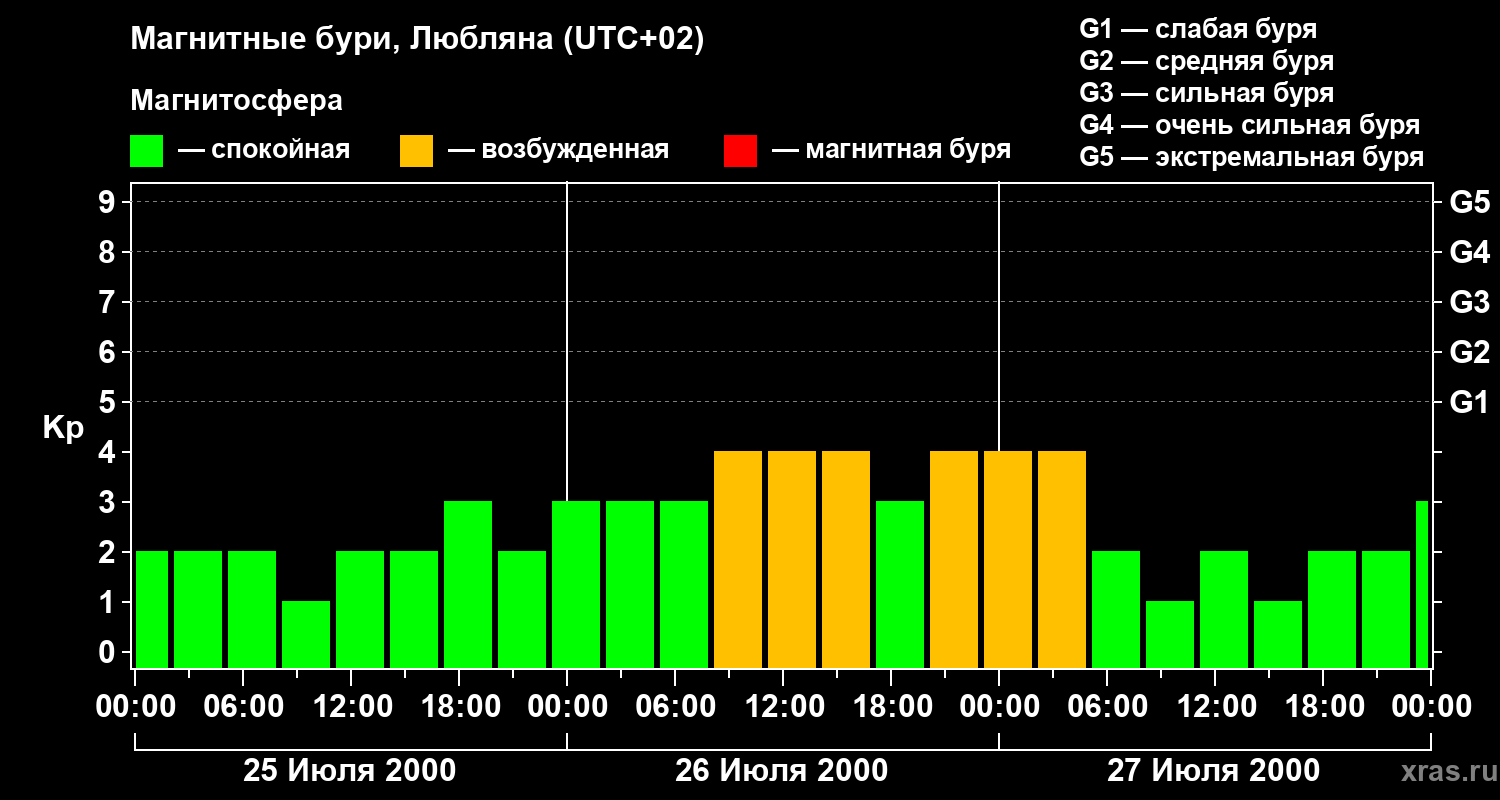 Изменения геомагнитного индекса Kp с 25 по 27 июля 2000 года для средних широт