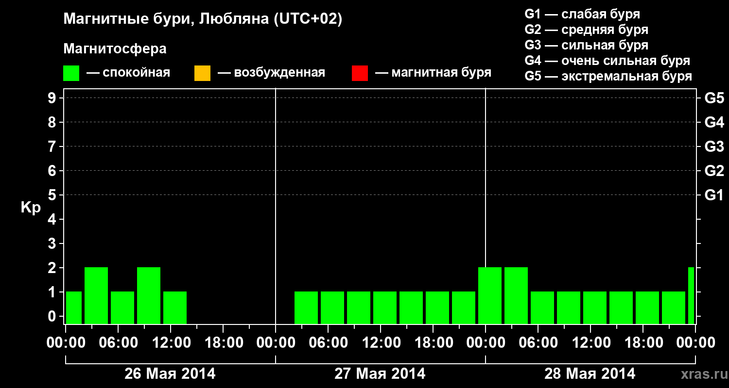 Изменения геомагнитного индекса Kp с 26 по 28 мая 2014 года для средних широт