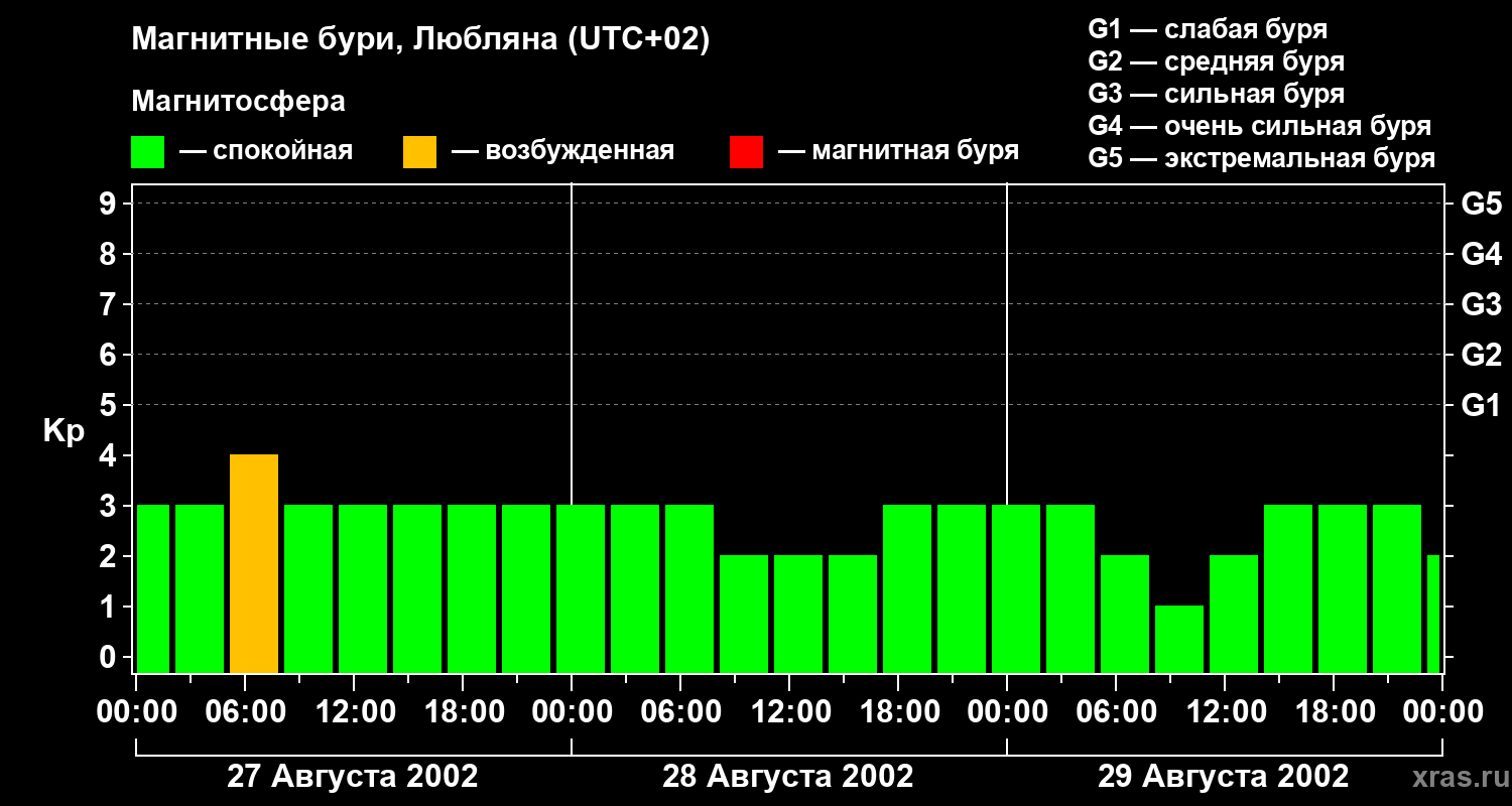 Изменения геомагнитного индекса Kp с 27 по 29 августа 2002 года для средних широт