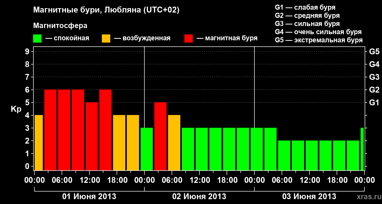 Изменения геомагнитного индекса Kp с 1 по 3 июня 2013 года для средних широт