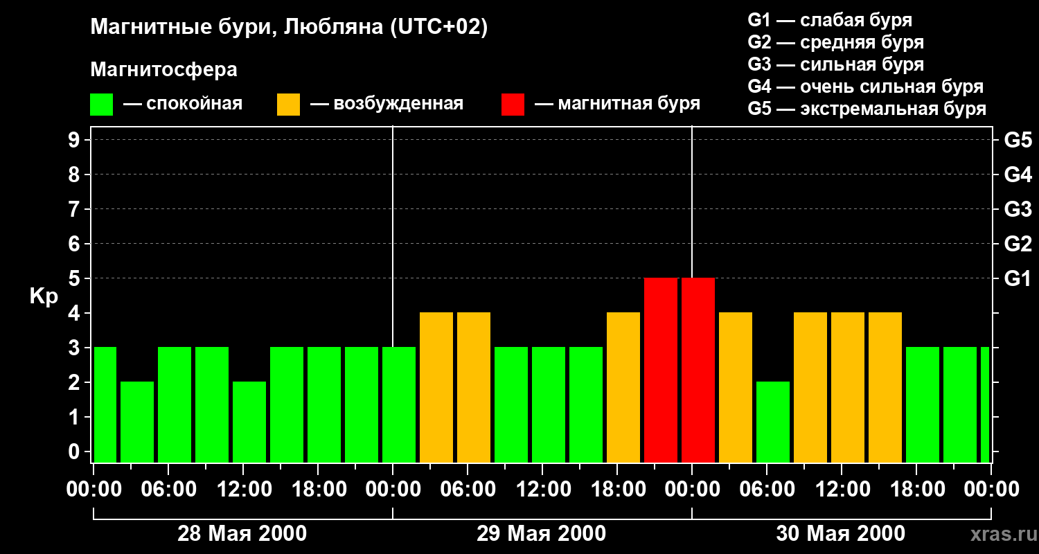 Изменения геомагнитного индекса Kp с 28 по 30 мая 2000 года для средних широт