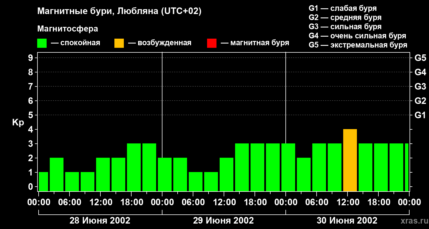 Изменения геомагнитного индекса Kp с 28 по 30 июня 2002 года для средних широт