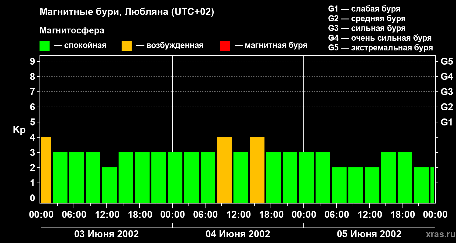 Изменения геомагнитного индекса Kp с 3 по 5 июня 2002 года для средних широт