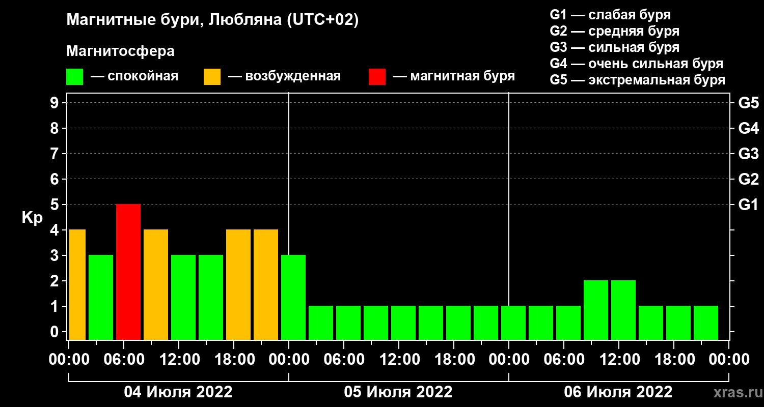 Изменения геомагнитного индекса Kp с 4 по 6 июля 2022 года для средних широт