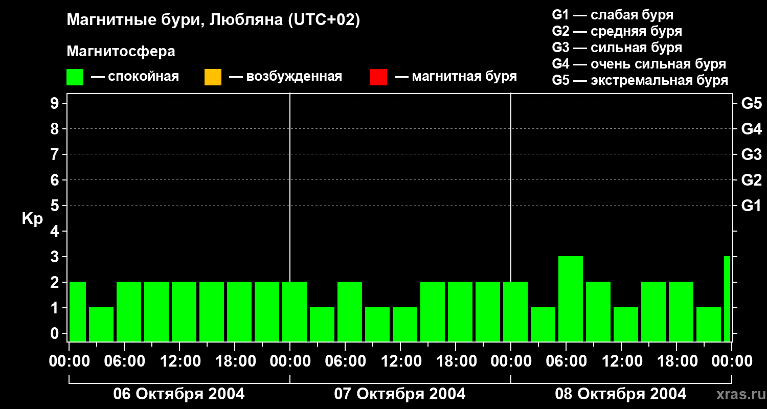 Изменения геомагнитного индекса Kp с 6 по 8 октября 2004 года для средних широт