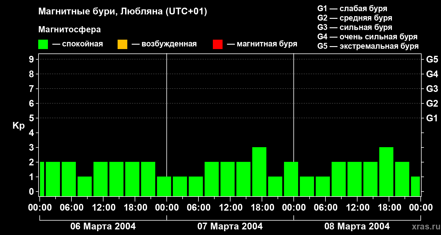 Изменения геомагнитного индекса Kp с 6 по 8 марта 2004 года для средних широт