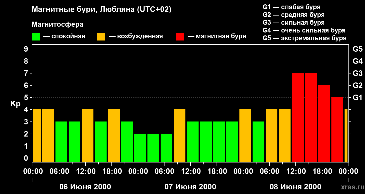 Изменения геомагнитного индекса Kp с 6 по 8 июня 2000 года для средних широт