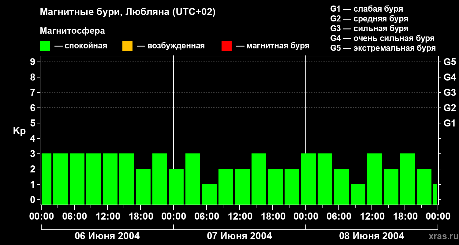 Изменения геомагнитного индекса Kp с 6 по 8 июня 2004 года для средних широт
