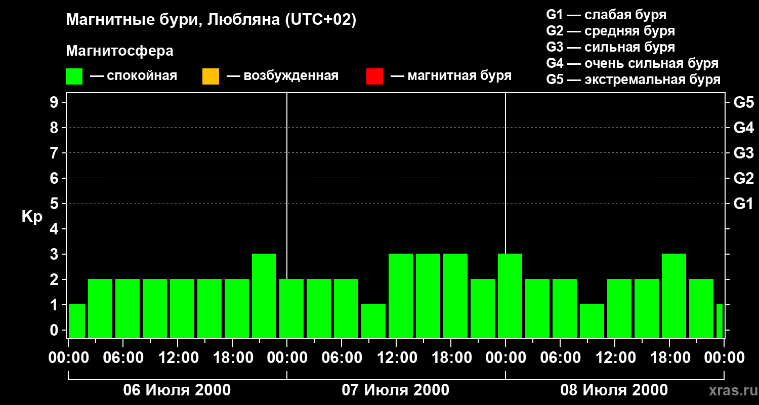 Изменения геомагнитного индекса Kp с 6 по 8 июля 2000 года для средних широт