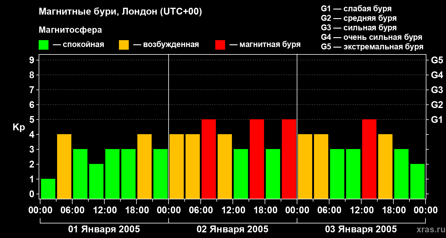 Изменения геомагнитного индекса Kp с 1 по 3 января 2005 года для средних широт