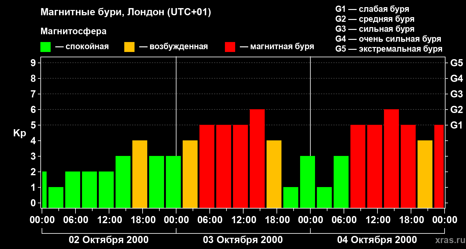 Изменения геомагнитного индекса Kp с 2 по 4 октября 2000 года для средних широт