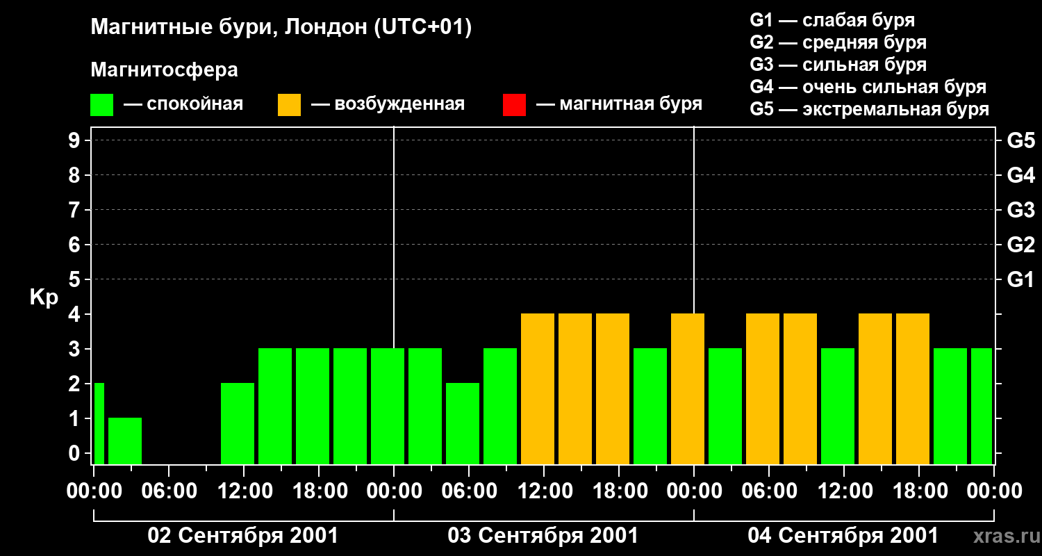 Изменения геомагнитного индекса Kp с 2 по 4 сентября 2001 года для средних широт
