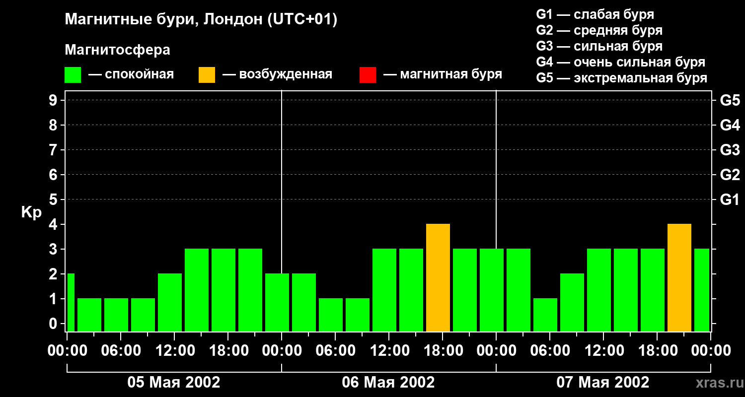 Изменения геомагнитного индекса Kp с 5 по 7 мая 2002 года для средних широт