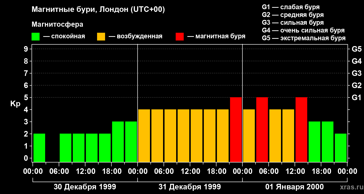 Изменения геомагнитного индекса Kp с 30 декабря 1999 года по 1 января 2000 года для средних широт