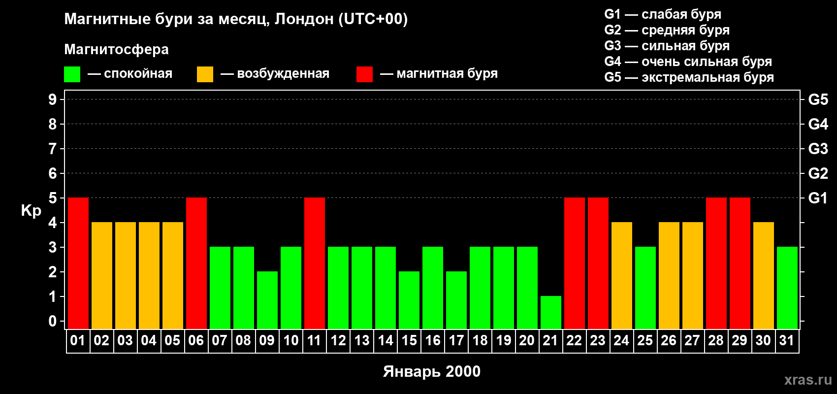 Изменения максимального суточного геомагнитного индекса Kp в январе 2000 года для средних широт