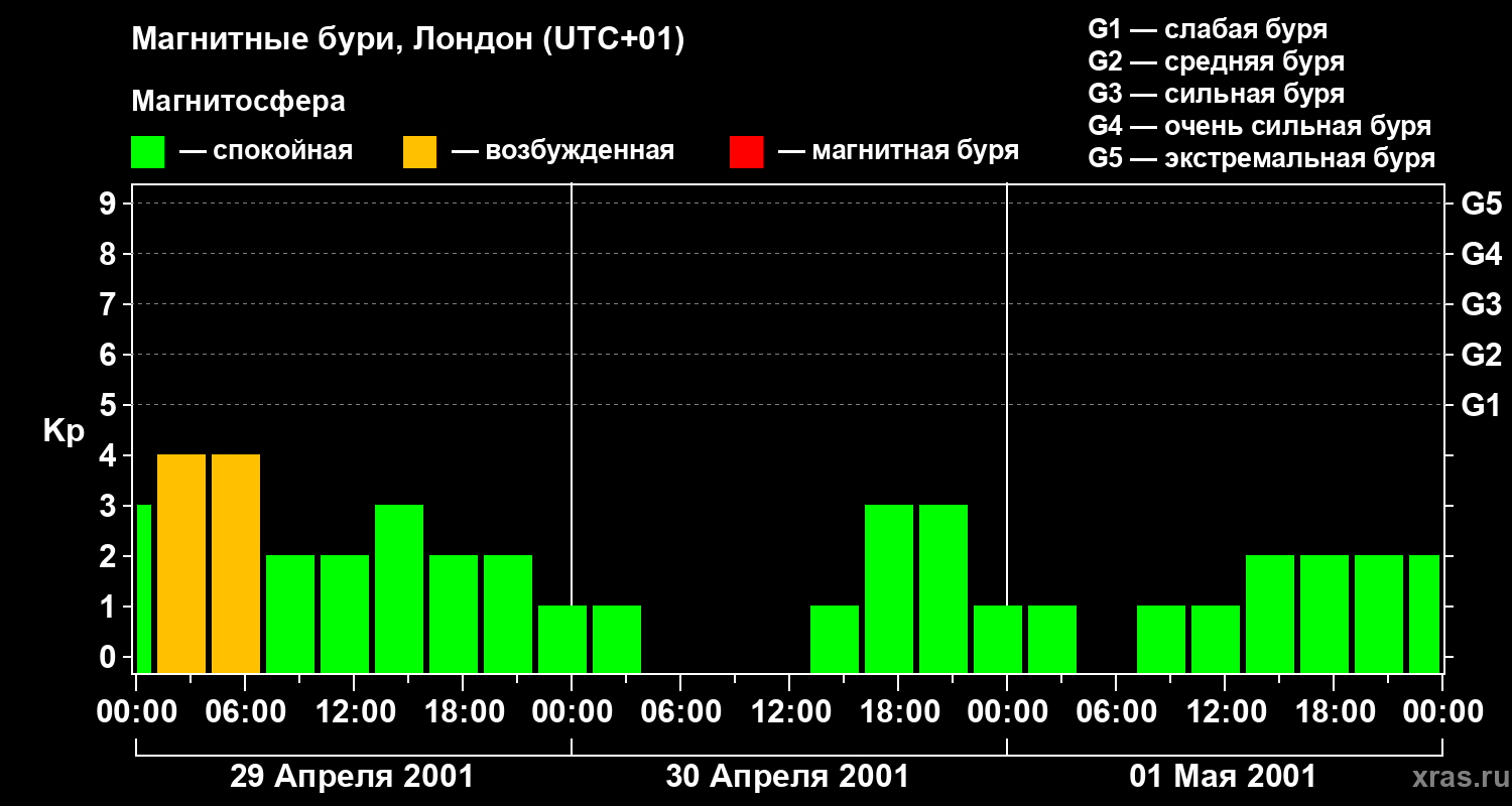 Изменения геомагнитного индекса Kp с 29 апреля по 1 мая 2001 года для средних широт