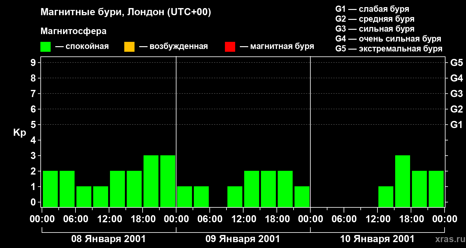 Изменения геомагнитного индекса Kp с 8 по 10 января 2001 года для средних широт