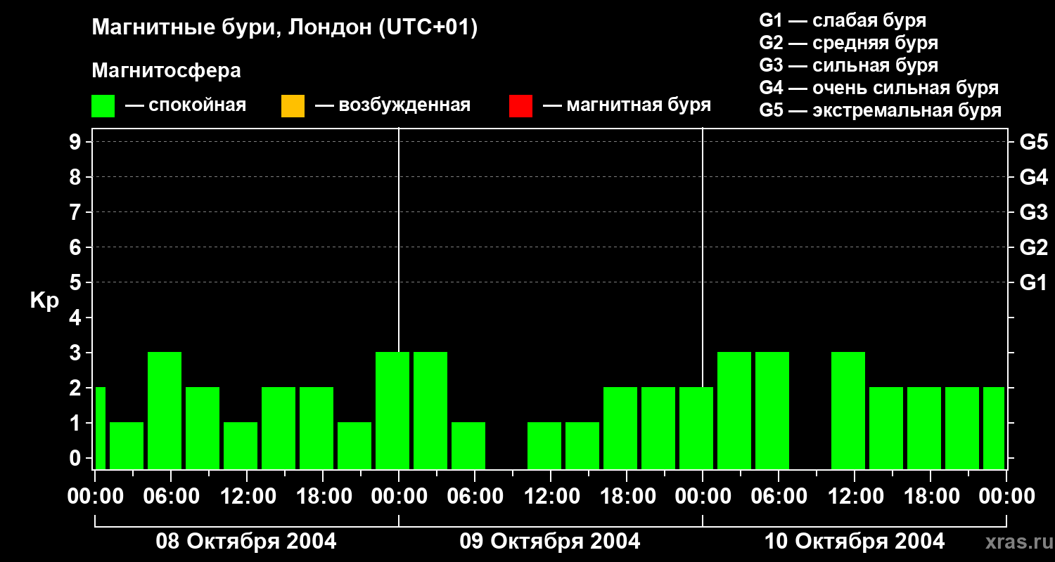 Изменения геомагнитного индекса Kp с 8 по 10 октября 2004 года для средних широт