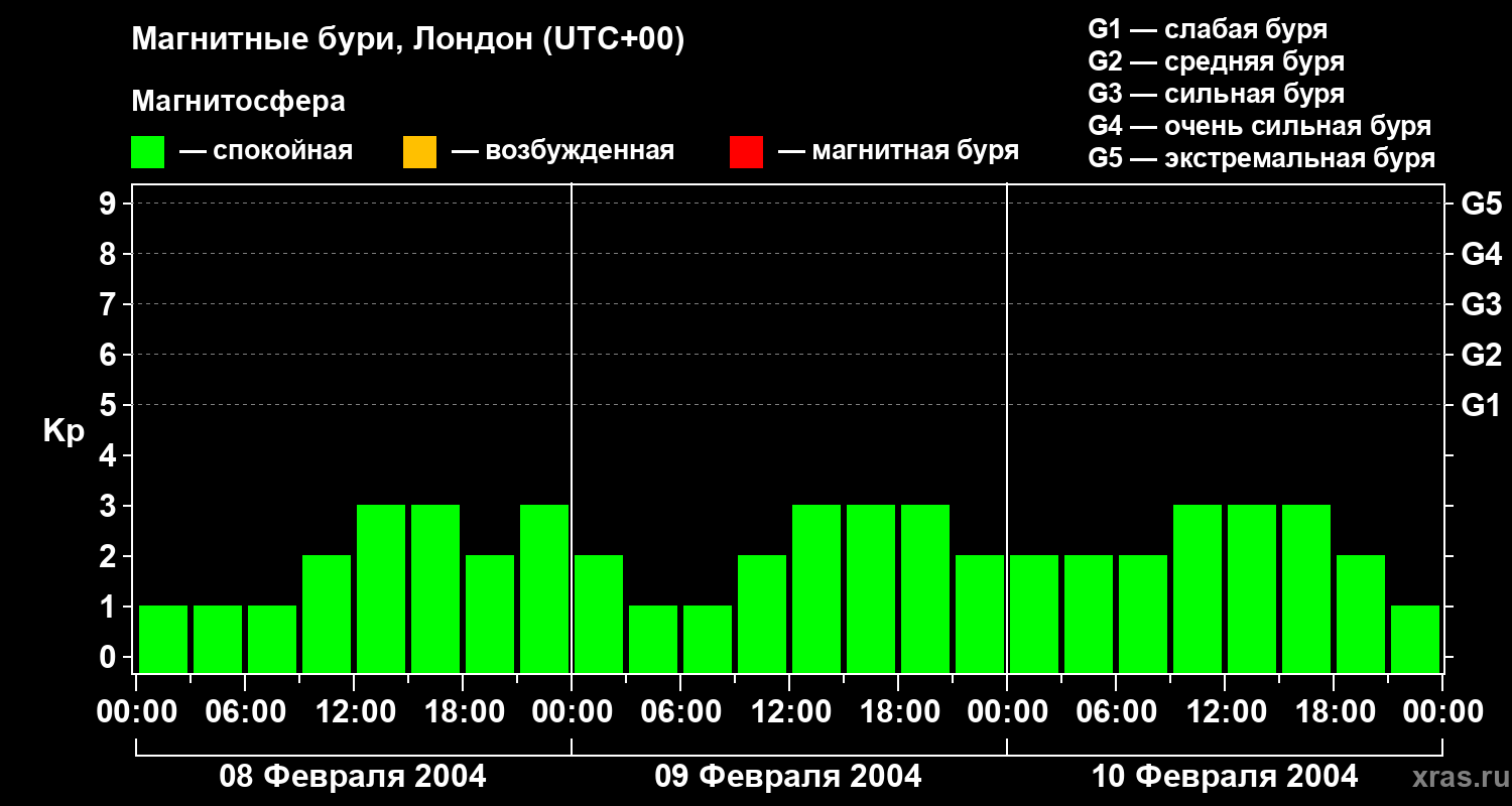 Изменения геомагнитного индекса Kp с 8 по 10 февраля 2004 года для средних широт