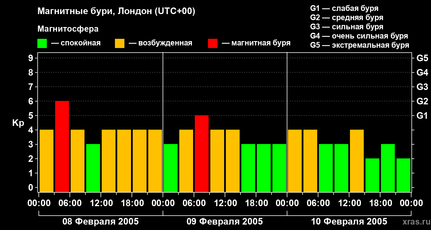 Изменения геомагнитного индекса Kp с 8 по 10 февраля 2005 года для средних широт