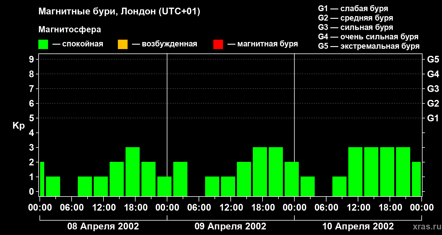 Изменения геомагнитного индекса Kp с 8 по 10 апреля 2002 года для средних широт