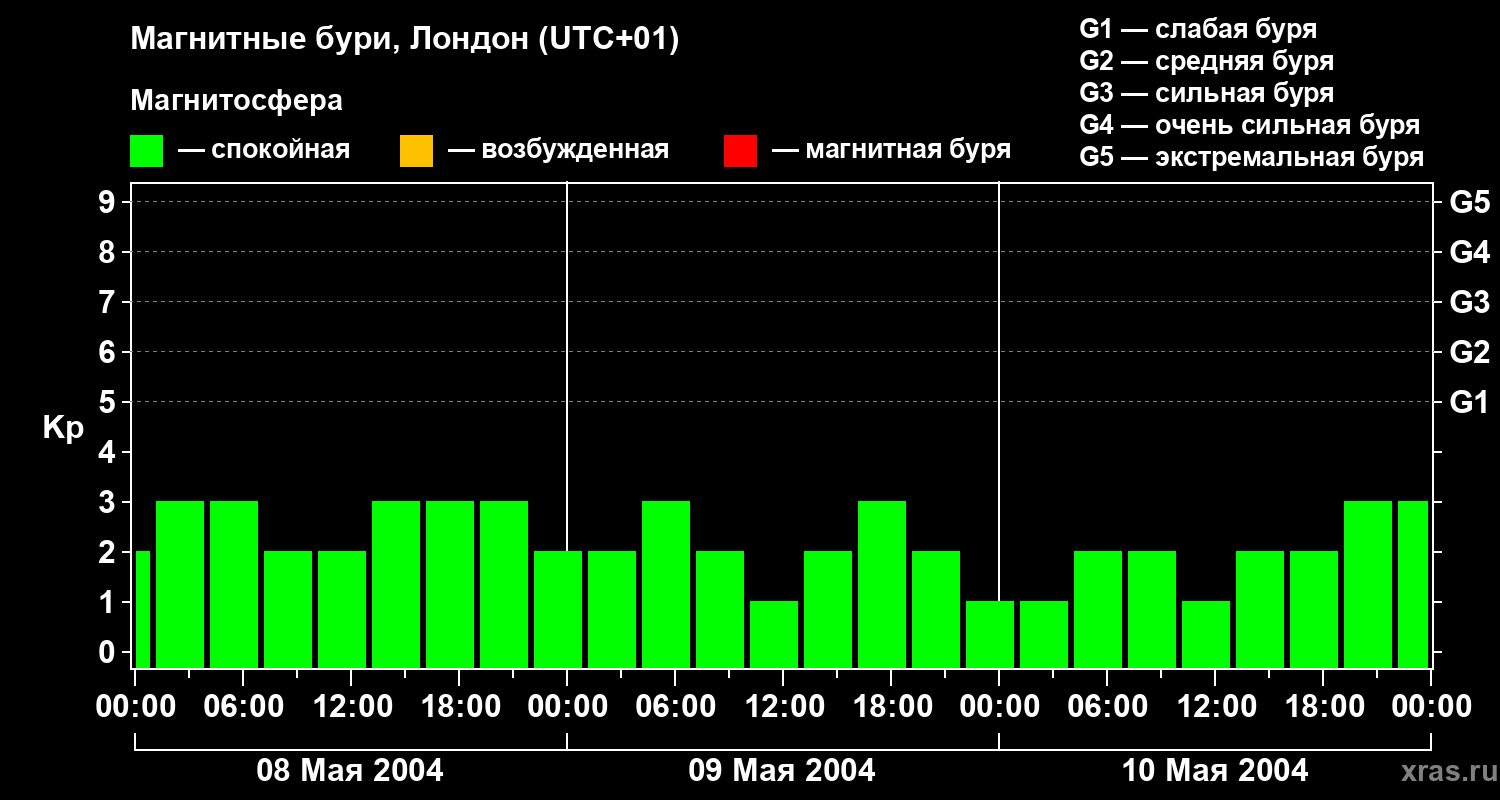 Изменения геомагнитного индекса Kp с 8 по 10 мая 2004 года для средних широт