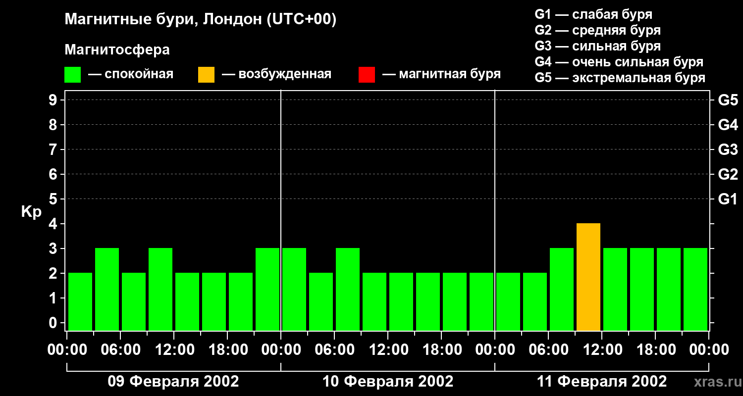 Изменения геомагнитного индекса Kp с 9 по 11 февраля 2002 года для средних широт
