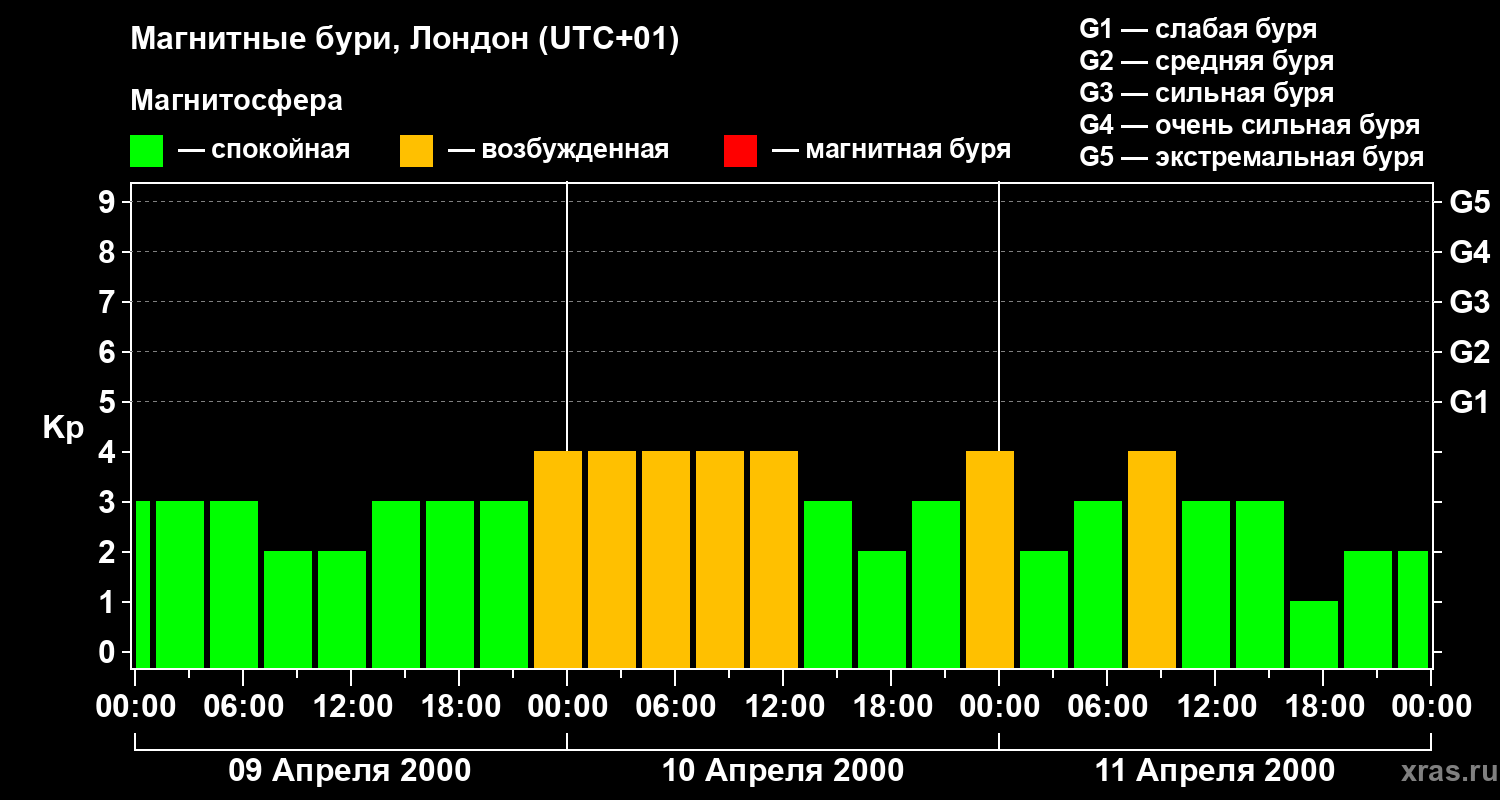 Изменения геомагнитного индекса Kp с 9 по 11 апреля 2000 года для средних широт