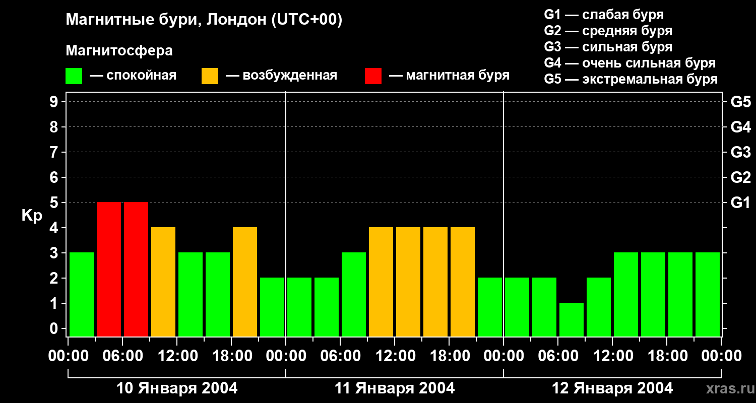 Изменения геомагнитного индекса Kp с 10 по 12 января 2004 года для средних широт