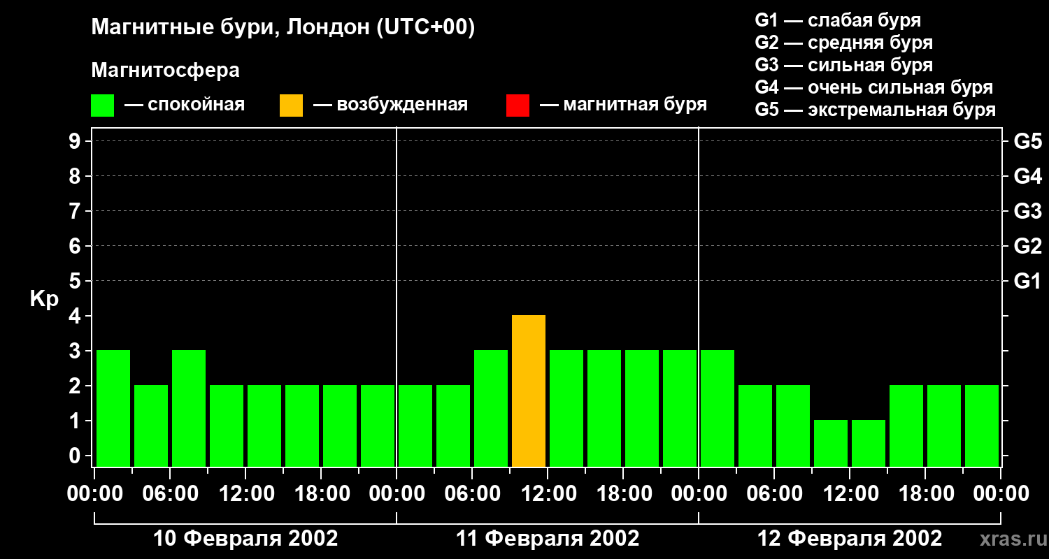 Изменения геомагнитного индекса Kp с 10 по 12 февраля 2002 года для средних широт