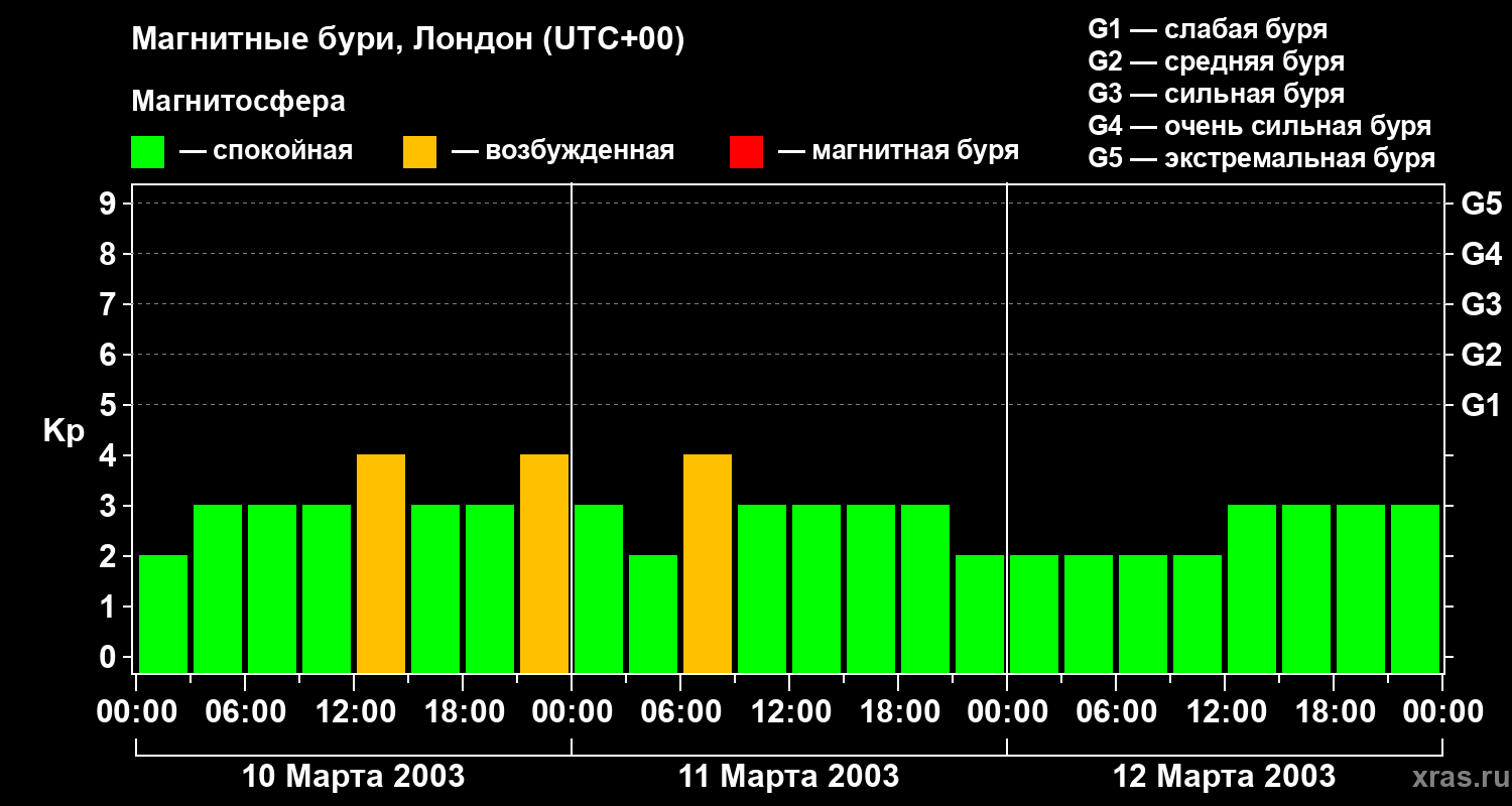 Изменения геомагнитного индекса Kp с 10 по 12 марта 2003 года для средних широт