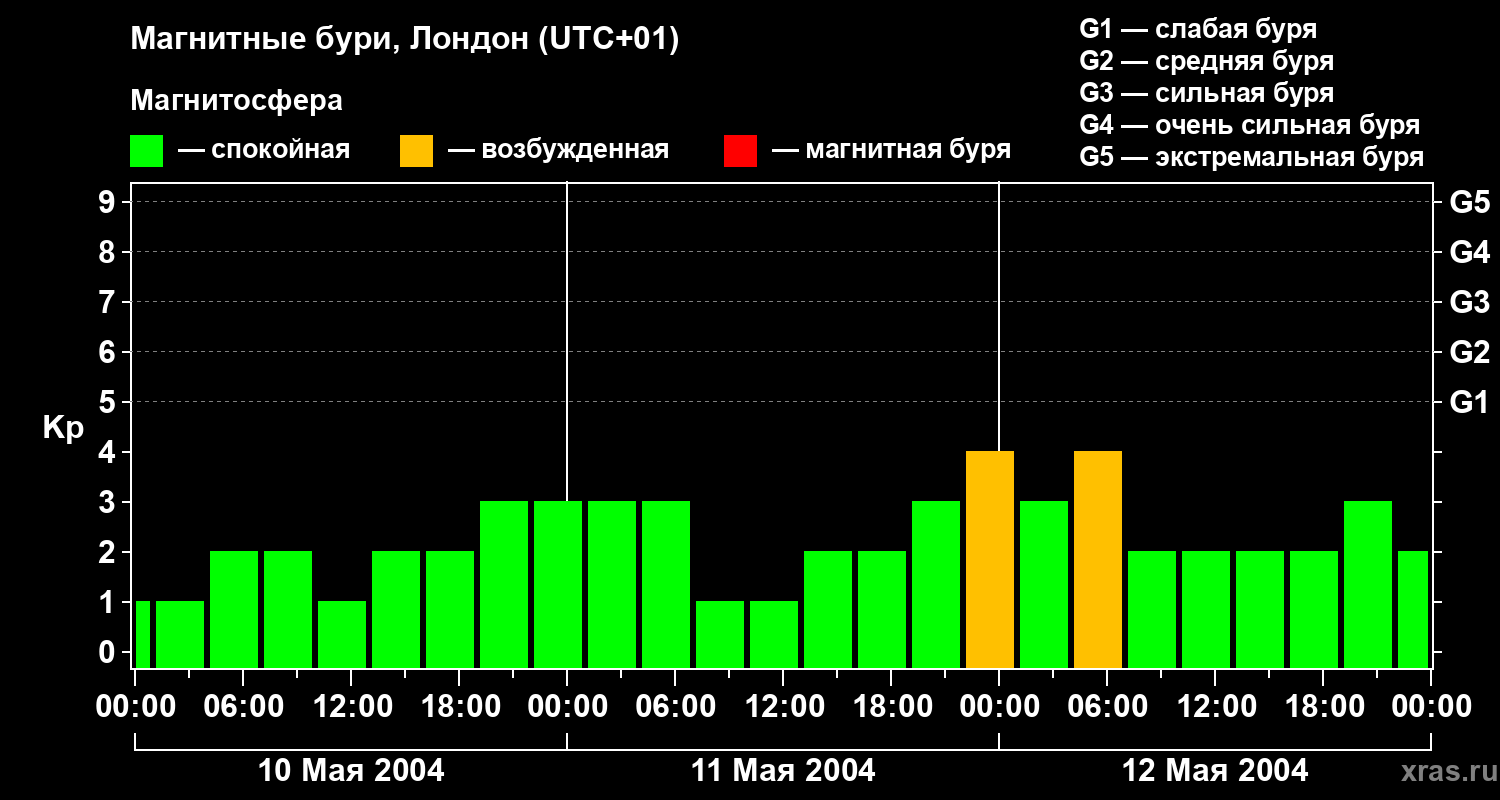 Изменения геомагнитного индекса Kp с 10 по 12 мая 2004 года для средних широт