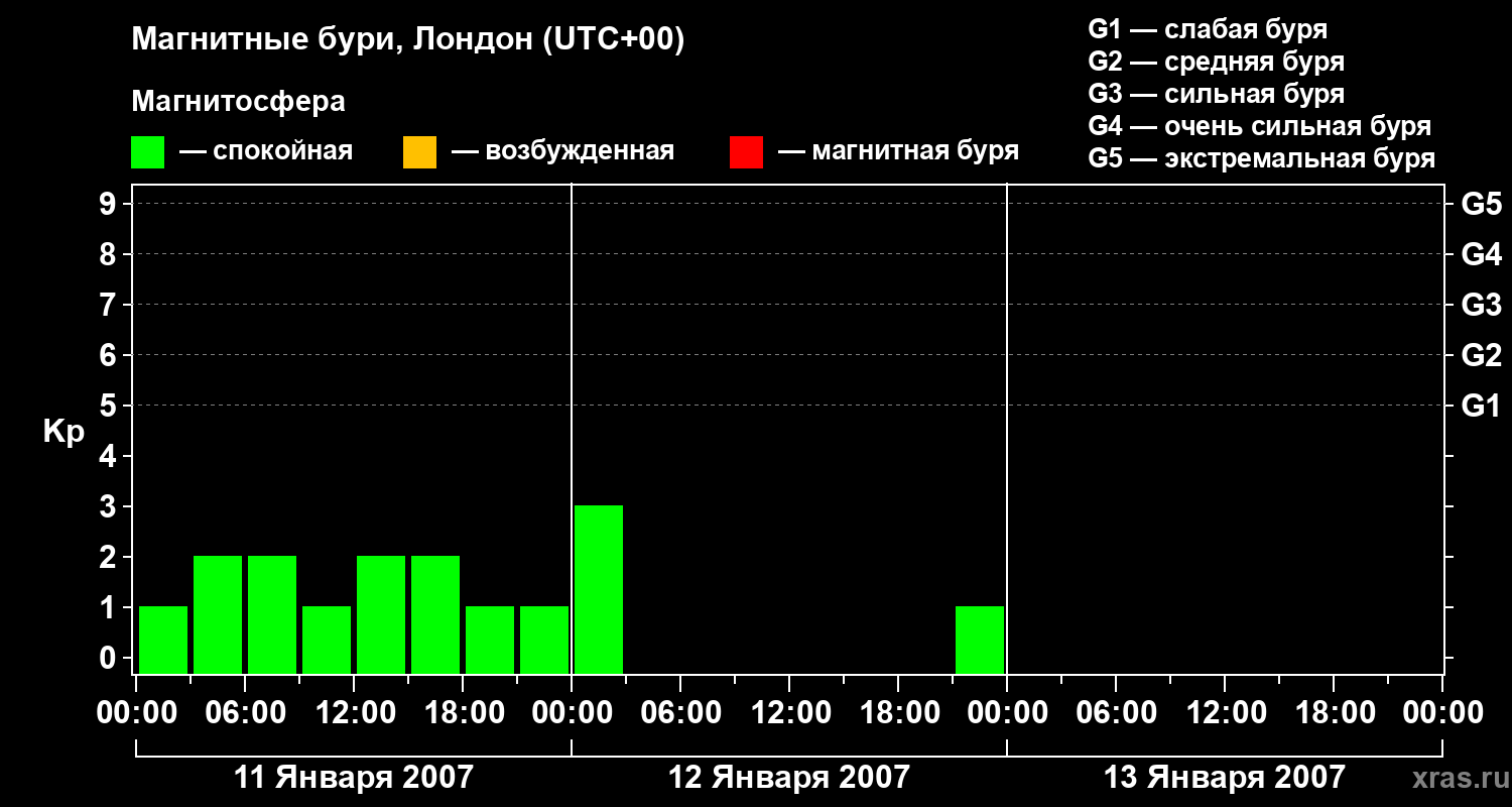Изменения геомагнитного индекса Kp с 11 по 13 января 2007 года для средних широт