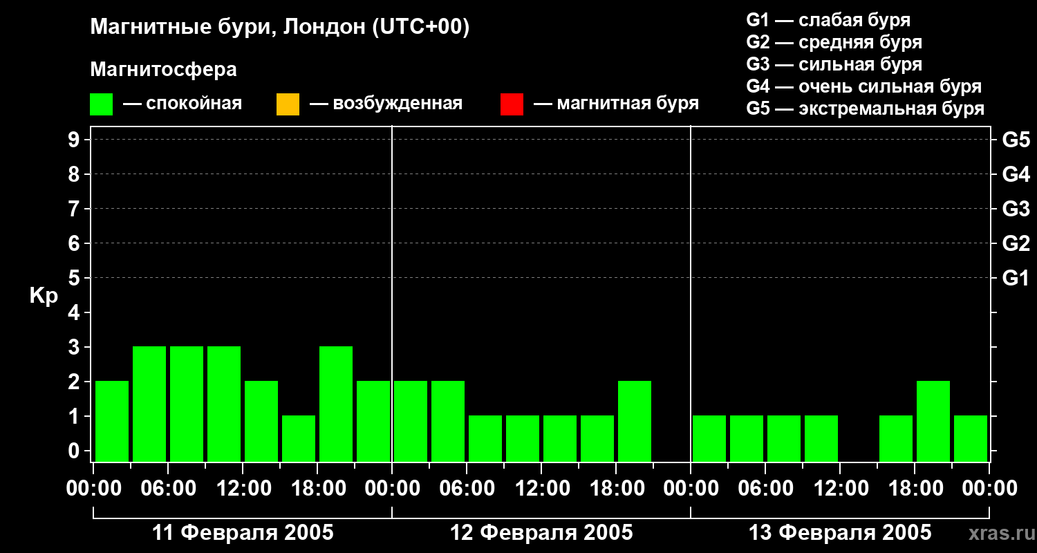 Изменения геомагнитного индекса Kp с 11 по 13 февраля 2005 года для средних широт
