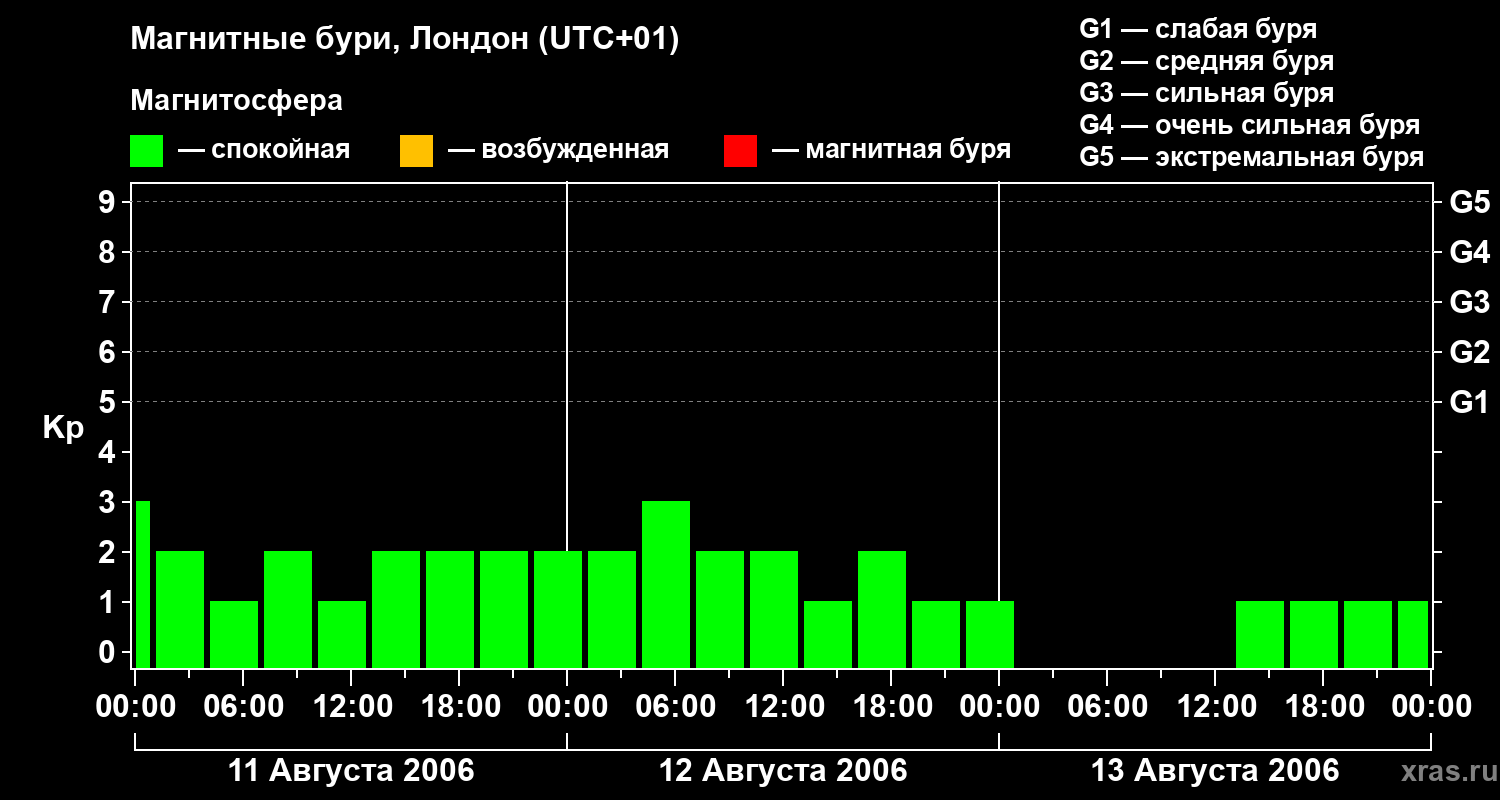 Изменения геомагнитного индекса Kp с 11 по 13 августа 2006 года для средних широт