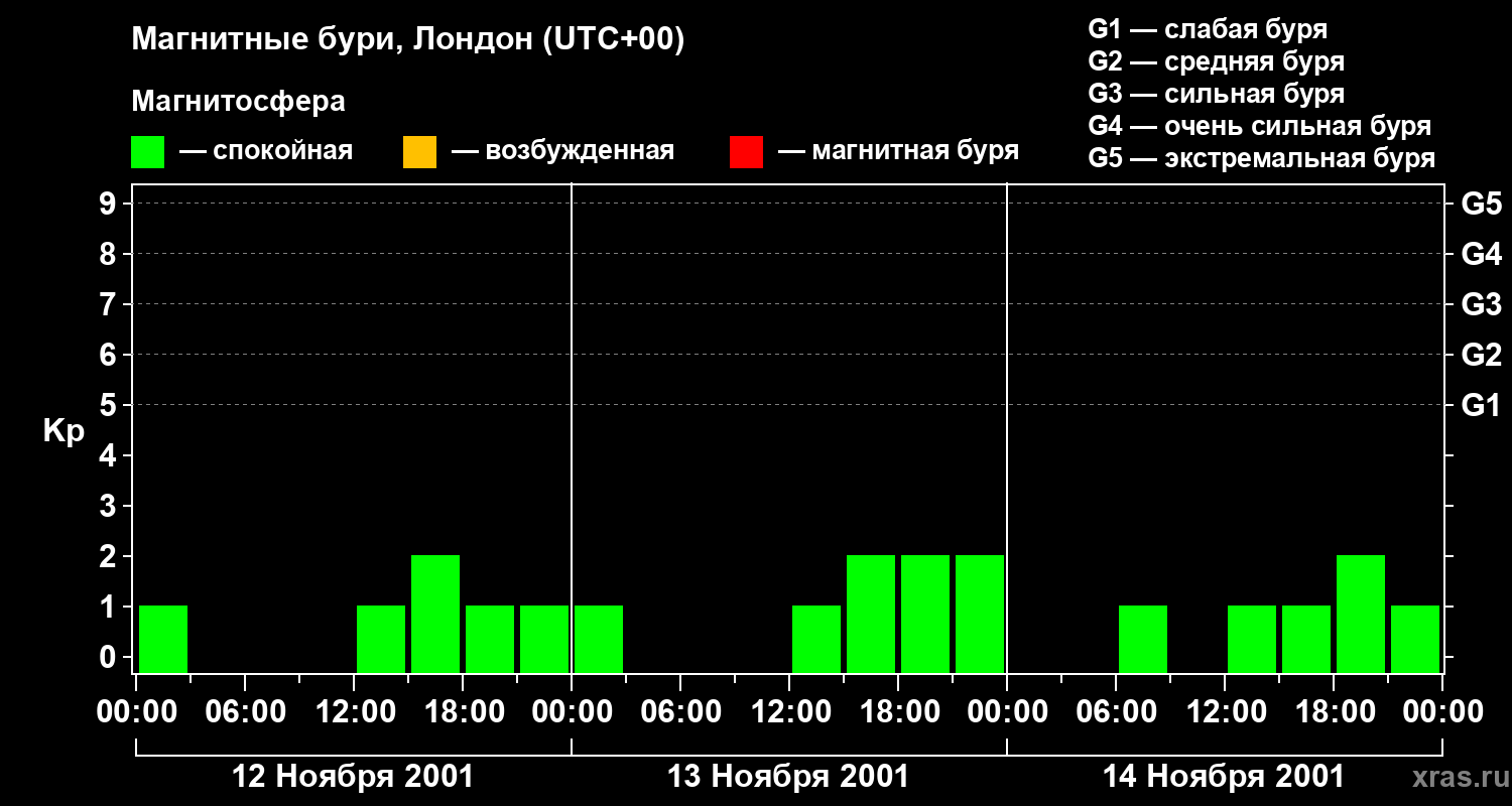 Изменения геомагнитного индекса Kp с 12 по 14 ноября 2001 года для средних широт