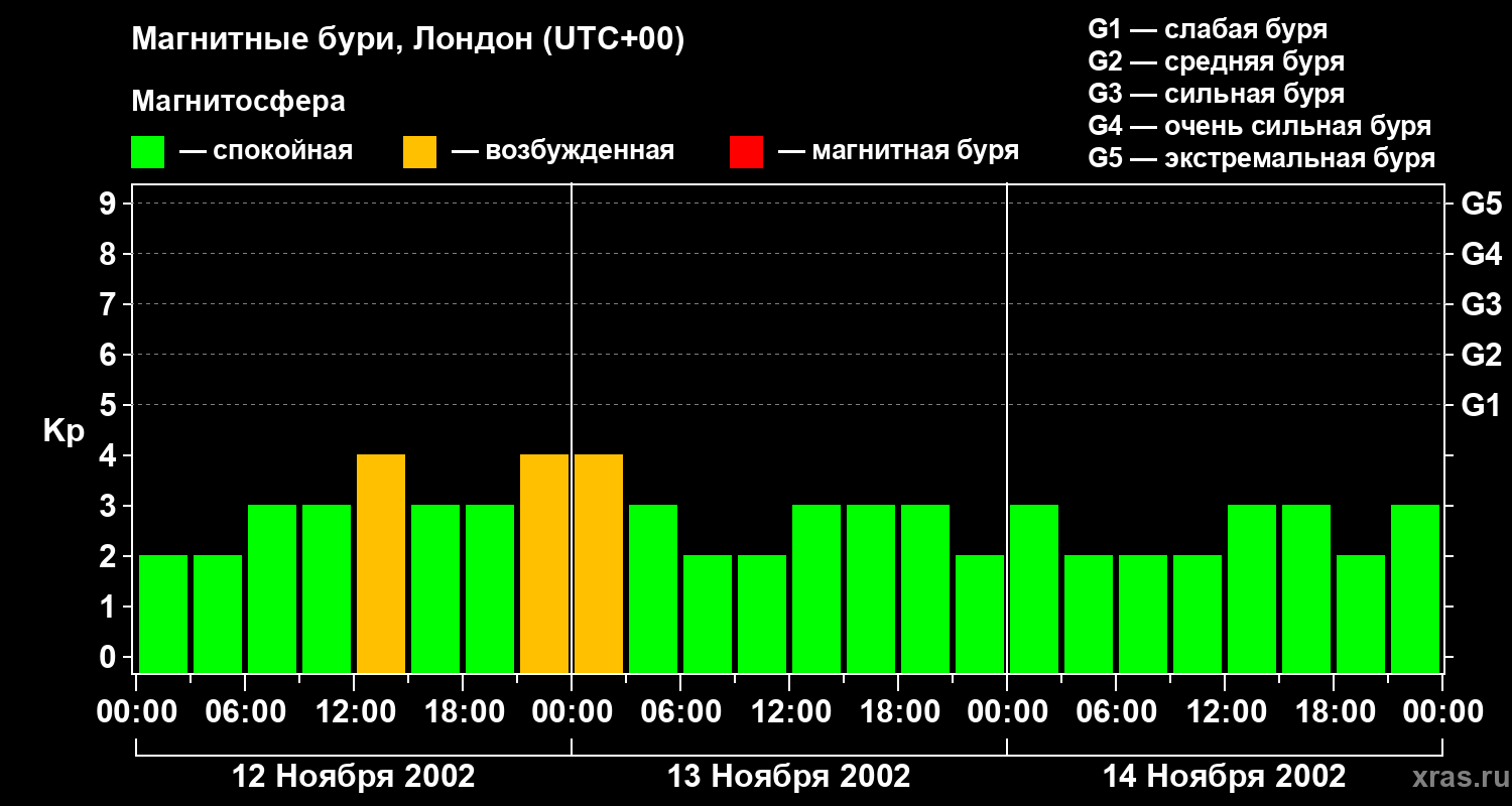 Изменения геомагнитного индекса Kp с 12 по 14 ноября 2002 года для средних широт