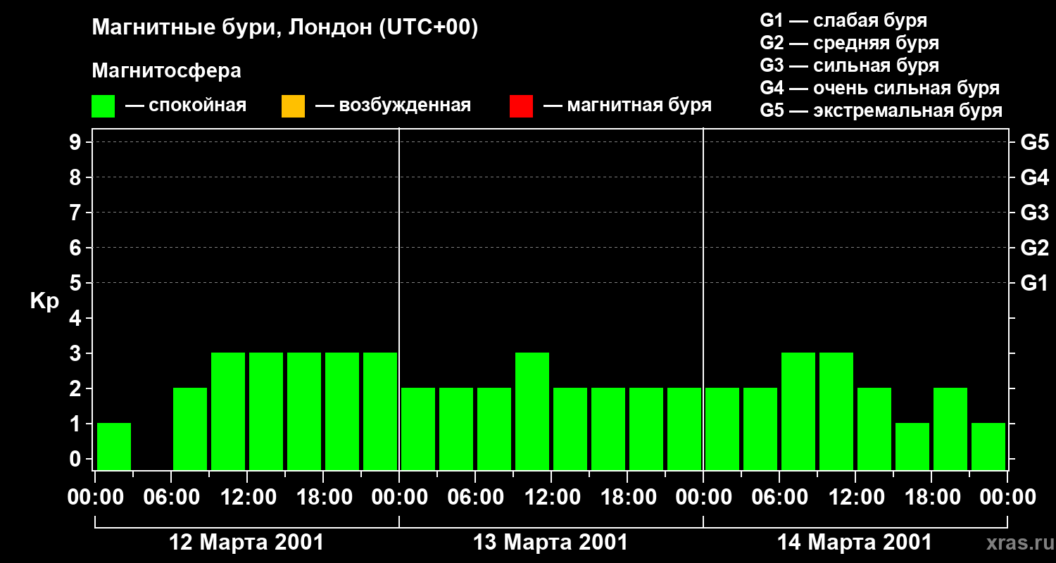 Изменения геомагнитного индекса Kp с 12 по 14 марта 2001 года для средних широт