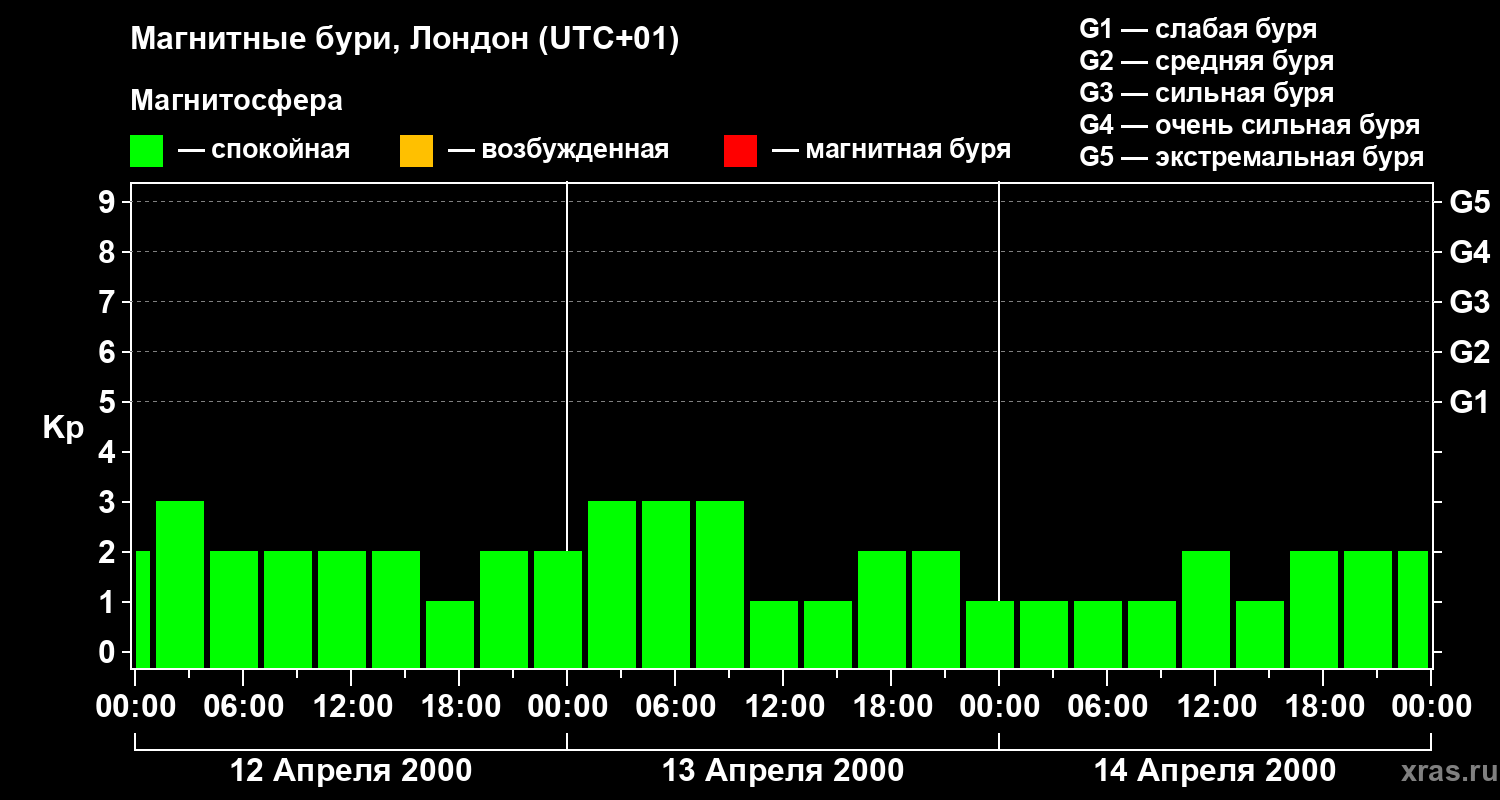 Изменения геомагнитного индекса Kp с 12 по 14 апреля 2000 года для средних широт