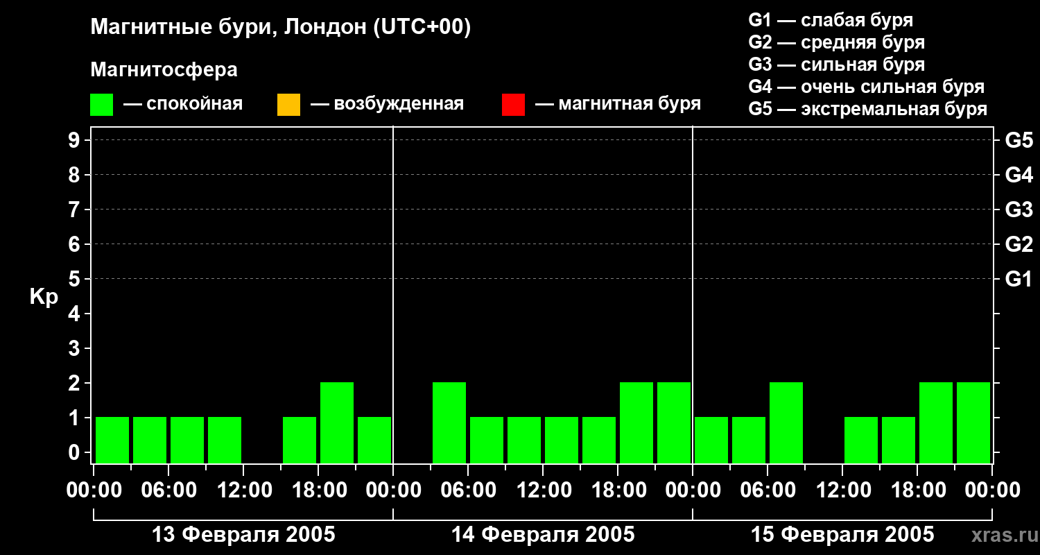 Изменения геомагнитного индекса Kp с 13 по 15 февраля 2005 года для средних широт