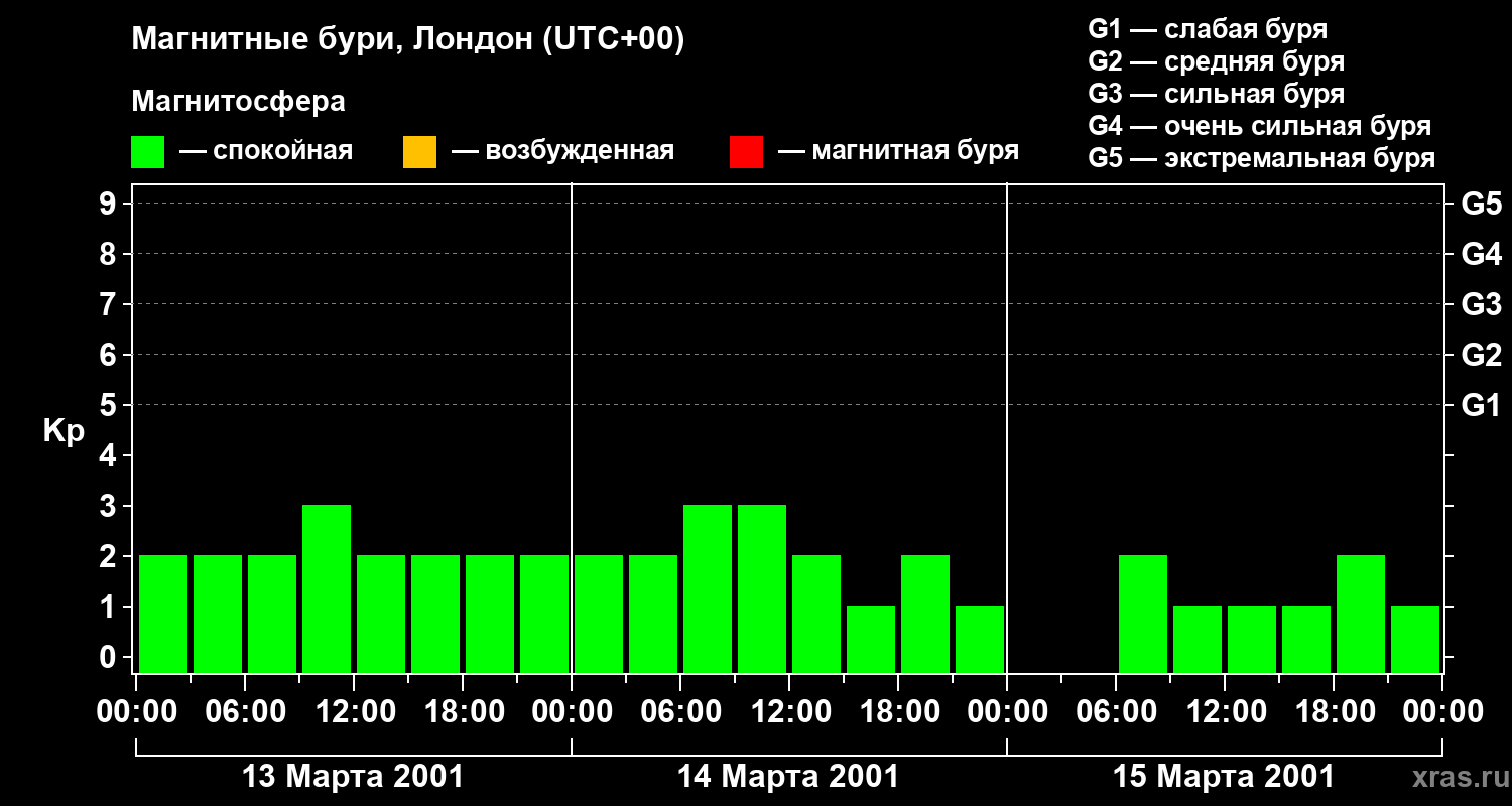 Изменения геомагнитного индекса Kp с 13 по 15 марта 2001 года для средних широт