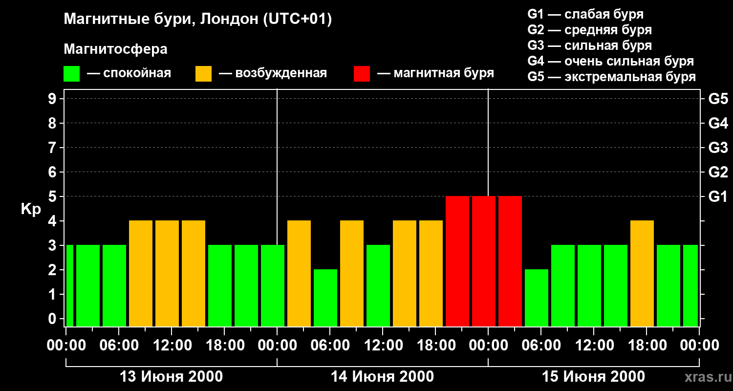 Изменения геомагнитного индекса Kp с 13 по 15 июня 2000 года для средних широт