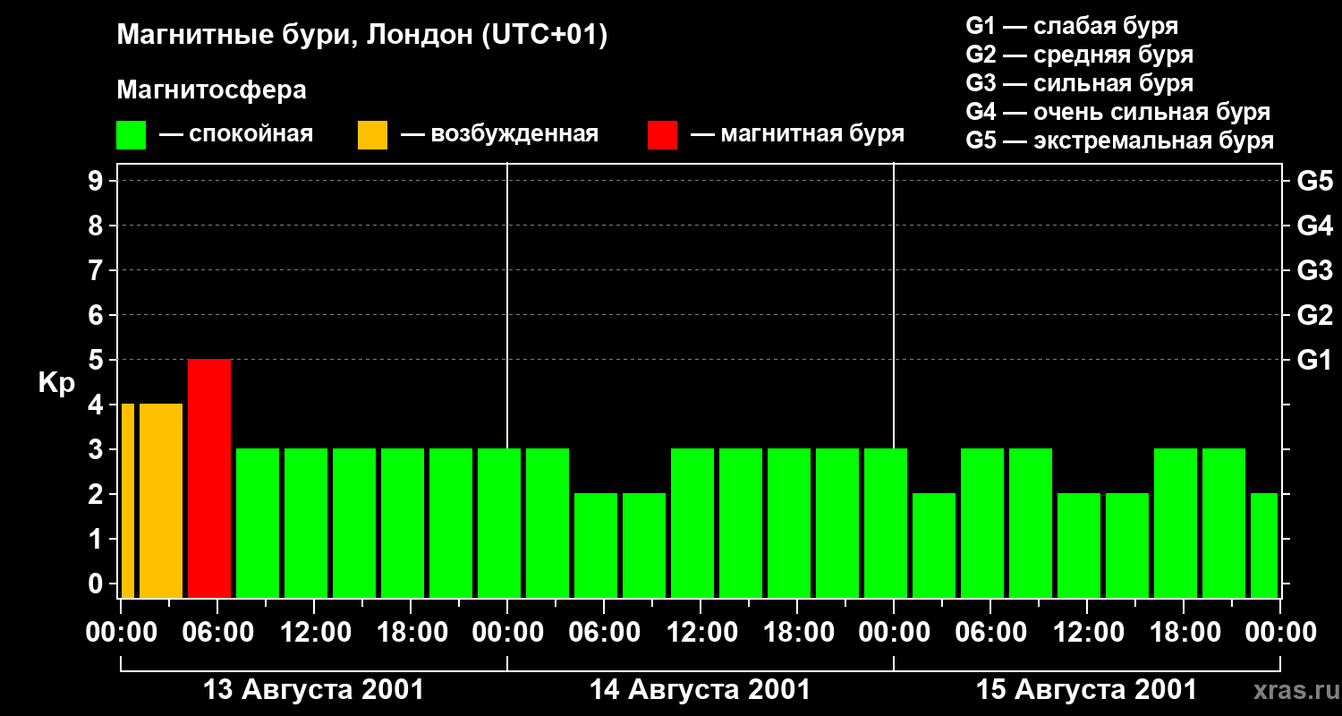 Изменения геомагнитного индекса Kp с 13 по 15 августа 2001 года для средних широт