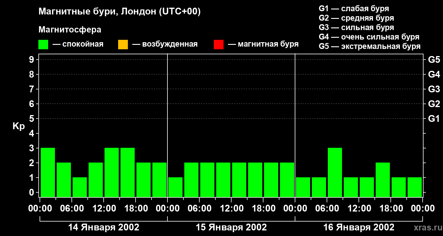 Изменения геомагнитного индекса Kp с 14 по 16 января 2002 года для средних широт