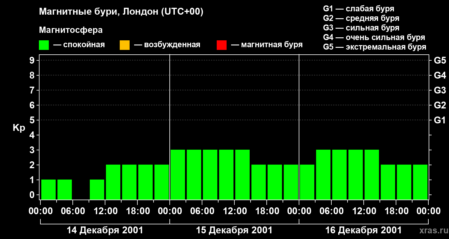 Изменения геомагнитного индекса Kp с 14 по 16 декабря 2001 года для средних широт