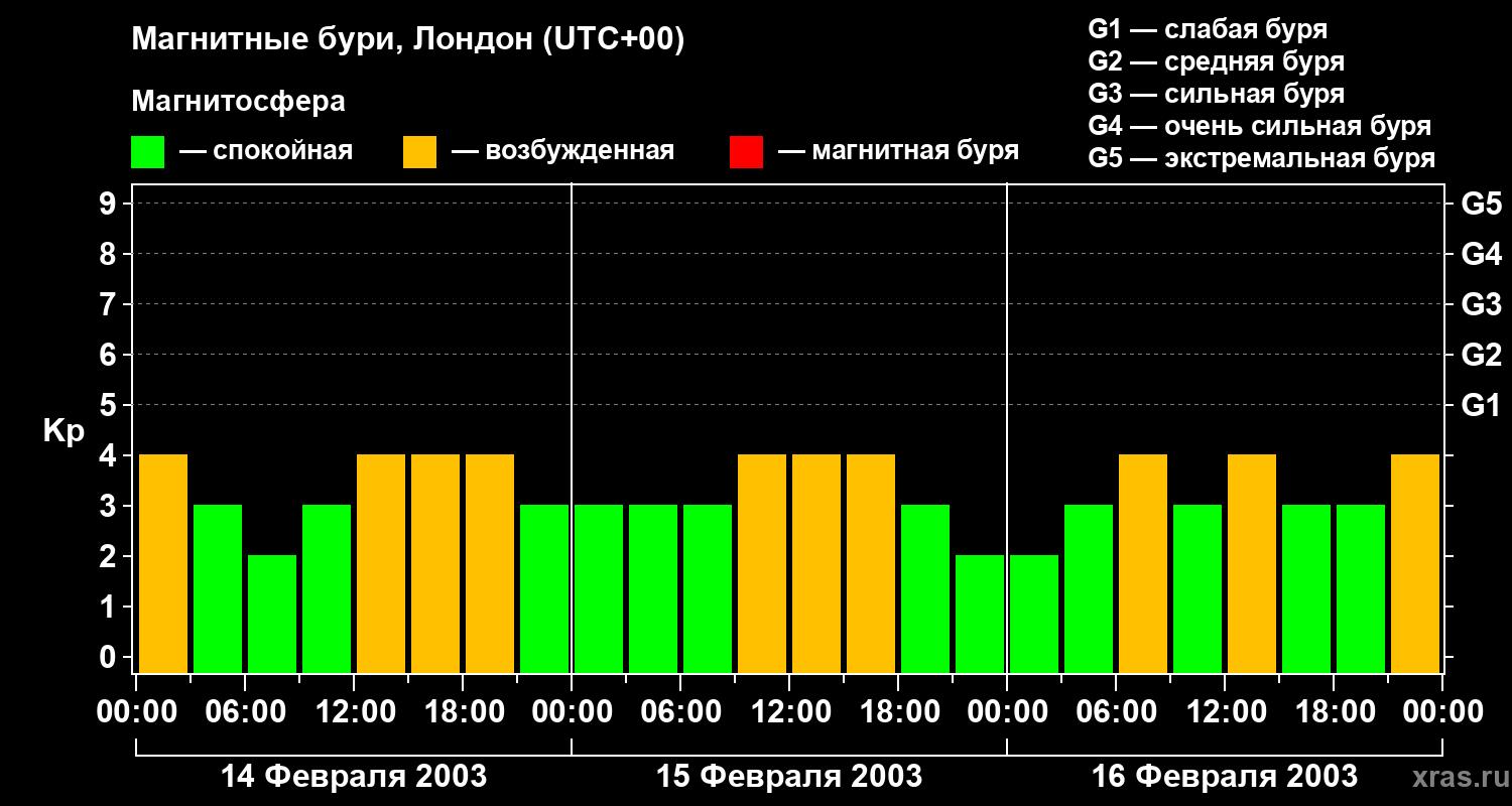 Изменения геомагнитного индекса Kp с 14 по 16 февраля 2003 года для средних широт