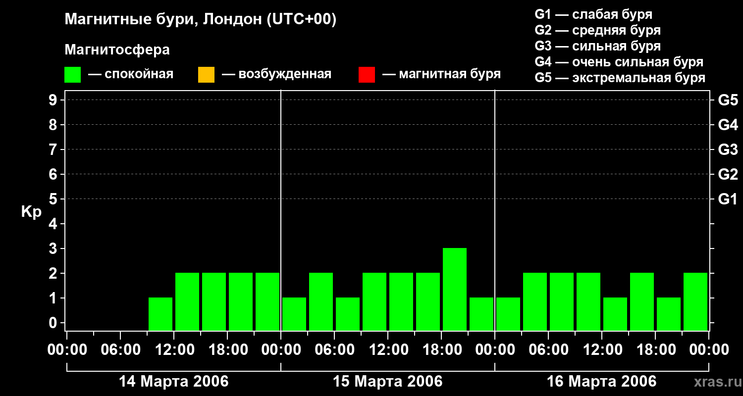 Изменения геомагнитного индекса Kp с 14 по 16 марта 2006 года для средних широт